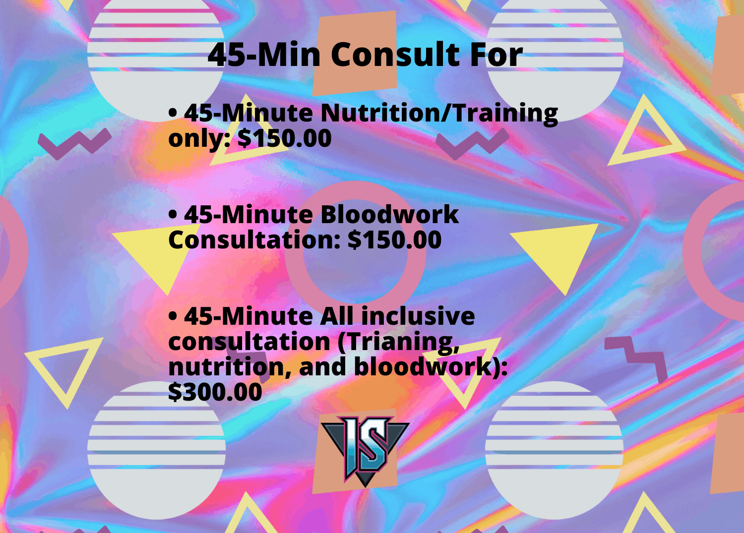 - $300.00 timing regarding training, diet, and bloodwork (pick 2 or more)